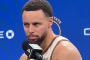 賽后,庫里接受媒體采訪期間記者手機(jī)鈴聲響了,庫里隨即跟隨音樂開始扭動身體。