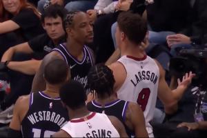 體育資訊1月21日訊 NBA常規(guī)賽,熱火130-117戰(zhàn)勝國(guó)王。在比賽中,熱火球員拉松和國(guó)王球員德羅贊發(fā)生了兩次沖突。