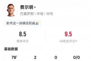 體育資訊1月22日訊 歐冠聯(lián)賽階段第7輪,巴薩客戰(zhàn)布拉格斯拉維亞,費(fèi)爾明首發(fā)出戰(zhàn),貢獻(xiàn)雙響,還有1次關(guān)鍵傳球,4次搶斷,評(píng)分8.5。