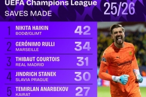 本賽季歐冠撲救次數(shù)榜