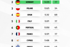 體育資訊1月23日訊 Football Rankings列出本賽季歐戰(zhàn)積分排名,最終排名前兩位的聯(lián)賽將獲得額外的歐冠席位。