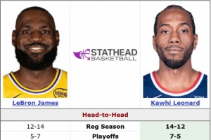 生涯至今,詹姆斯常規(guī)賽面對(duì)倫納德12勝14負(fù),季后賽5勝7負(fù)。