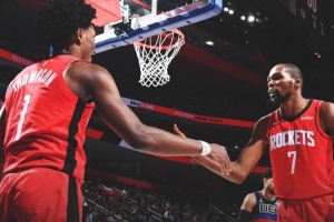 賽后火箭官推發(fā)布贏球海報,封面為杜蘭特和阿門擊掌瞬間。