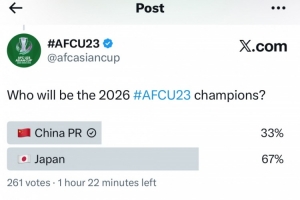 亞足聯(lián)官推發(fā)起了對最終奪冠球隊預(yù)測的投票,其中33%的球迷支持U23國足奪冠,67%的球迷更看好日本U23奪冠。