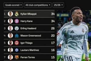 體育資訊1月25日訊 在本輪西甲,皇馬2-0擊敗比利亞雷亞爾,姆巴佩梅開二度。以下為五大聯(lián)賽球員在本賽季各項賽事總進球榜,姆巴佩與凱恩均打進34球,具體如下: