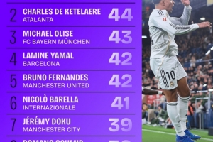 體育資訊1月27日訊 Squawka統(tǒng)計(jì)出本賽季歐洲五大聯(lián)賽運(yùn)動(dòng)戰(zhàn)創(chuàng)造機(jī)會(huì)排行榜,皇馬當(dāng)家球星姆巴佩50次位居第一。