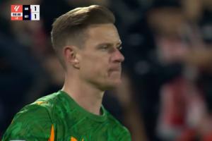 比賽的最后時刻,赫羅納禁區(qū)內(nèi)出現(xiàn)險情,特爾施特根近距離將球撲住,力保球隊不被絕殺。