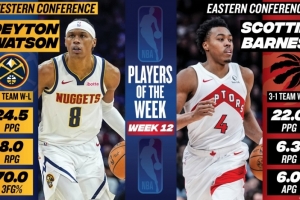 體育資訊1月13日訊 今日NBA官方宣布,掘金隊(duì)的沃特森和猛龍球星巴恩斯分獲西部和東部周最佳球員。