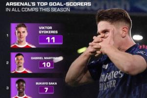 阿森納本輪英超4-0客勝利茲聯(lián),目前槍手本賽季的隊(duì)內(nèi)各項(xiàng)賽事射手榜情況如下:
