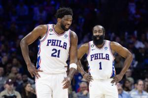 在常規(guī)賽賽場上,哈登和恩比德一共對決過10次,兩人各自贏下5次。