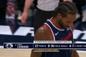 (注:倫納德個(gè)人最長(zhǎng)紀(jì)錄為連續(xù)22場(chǎng)得分20+)