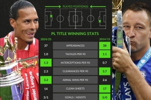 范戴克(利物浦,24-25賽季):37場,14零封,3球1助攻,獲評7.07分。每90分鐘1.0搶斷、1.3攔截、2.3解圍、3.2成功爭頂。