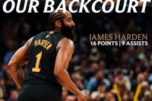 輕松贏球!騎士官方曬后場雙槍數(shù)據(jù)海報(bào):米切爾17+5 哈登16+9