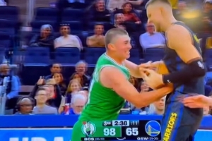 賽后采訪,完成勇士首秀的波爾津吉斯接受了記者采訪。談到自己和普理查德?lián)屒颍f道:“我不會輕易放棄那個球的。當(dāng)時我們落后很多,所以我的心情本來就不太好。但其實那只是和老隊友之間的一個有趣瞬間,只是開開玩笑而已?!?/p>