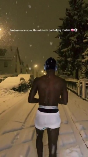 視頻中杰克遜全身赤裸,只穿著一條短褲,他還配文:冬天已經(jīng)不再新鮮了,它現(xiàn)在是我日常的一部分。
