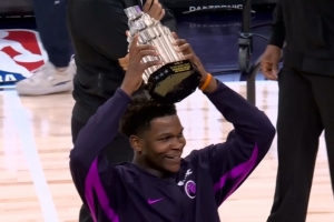 體育資訊2月21日訊 森林狼主場迎戰(zhàn)獨行俠,賽前,愛德華茲在主場向球迷們展示全明星MVP獎杯,接受球迷們的歡呼。
