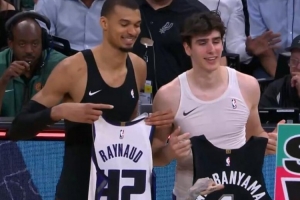 賽后,國王中鋒雷諾和好友文班亞馬交換球衣。