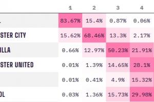 爭冠集團(tuán)方面,阿森納贏下北倫敦德比后,奪冠概率回升至83.67%,曼城則是15.62%。維拉有高達(dá)50.23%的概率在賽季末排名第三。