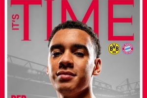 拜仁本次發(fā)布的海報(bào)設(shè)計(jì)獨(dú)具匠心,采用了知名雜志《TIME》的封面風(fēng)格。拜仁前鋒穆西亞拉身著球隊(duì)紅白戰(zhàn)袍占據(jù)封面,海報(bào)上方印有醒目的紅色大字“IT'S TIME”,下方則用德語(yǔ)標(biāo)注"經(jīng)典對(duì)決”,并配上了主帥孔帕尼的評(píng)價(jià):“這是一場(chǎng)頂級(jí)較量”。