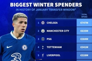 體育資訊1月15日訊 《轉(zhuǎn)會市場》統(tǒng)計了截止今年1月15日以來的冬窗歷史轉(zhuǎn)會總支出情況,切爾西力壓曼城居首,前十英超占據(jù)8席。