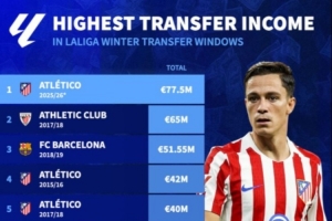 體育資訊1月16日訊 隨著出售拉斯帕多里和加拉格爾,根據(jù)德轉(zhuǎn)數(shù)據(jù),馬競以7750萬歐成西甲歷史上冬窗收入最高的球隊。