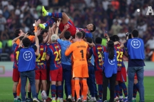 體育資訊1月16日訊 巴薩全隊在奪得西超杯冠軍賽后圍在剛剛回歸的阿勞霍身邊慶祝,并被歡欣鼓舞的隊友們高高拋起,替補出場的他最后也作為隊長舉起了獎杯。