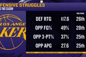 四處漏風(fēng)!媒體總結(jié)湖人本賽季多項(xiàng)防守?cái)?shù)據(jù)均位列聯(lián)盟末流