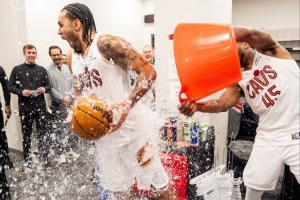 賽后,騎士官推曬圖,泰森得到了本場的比賽用球,當(dāng)家球星米切爾則潑水慶祝泰森的出色表現(xiàn)。