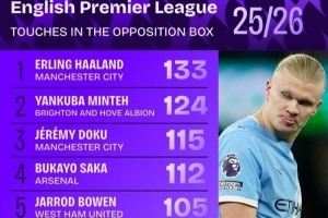 本賽季英超對(duì)方禁區(qū)觸球榜: