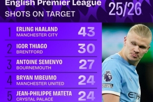 本賽季英超射正榜: