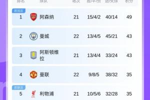 英超積分榜: