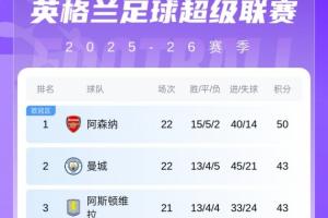 最新的積分榜方面:阿森納7分領(lǐng)跑,暫排第2的曼城本輪在曼市德比中0-2不敵曼聯(lián),先賽的情況下與維拉同積43分。明晨維拉主場迎戰(zhàn)埃弗頓,只要不敗就能升至第2。