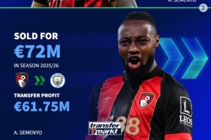 體育資訊1月10日訊 曼城已經(jīng)官宣簽下塞梅尼奧,《轉(zhuǎn)會市場》統(tǒng)計顯示這也是伯恩茅斯近年來通過轉(zhuǎn)賣盈利最多的一筆交易(單位:歐元)。