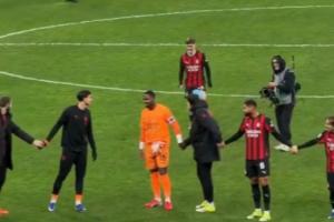 米蘭球員手拉手跑到一半停下,落在最后的薩勒馬科爾斯腿上綁著冰袋,他一瘸一拐的趕上來還跳到了邁尼昂的背上。