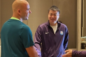 記者顧穎在個人微博寫道:葡萄牙籍教練費利佩·佩德羅到??谡覈矆蟮搅?,剛才早餐時間,費利佩到津門虎餐廳這邊打了個招呼,也遇上了主教練于根偉。