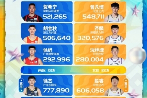 體育資訊1月19日訊 CBA官方發(fā)布了2026CBA全明星賽首發(fā)球員票選第二周票數(shù)情況。徐杰當選第二周南區(qū)票王,趙睿當選第二周北區(qū)票王。